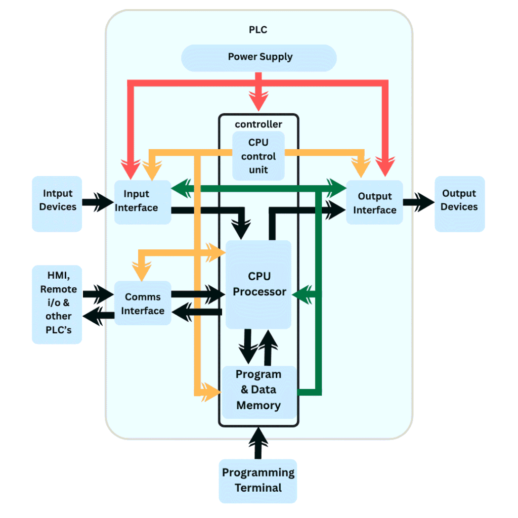 How a PLC Works – Step by Step:Input Scan: The PLC reads the status of all connected input devices such as sensors, switches, and buttons. These real-time values are stored in memory.